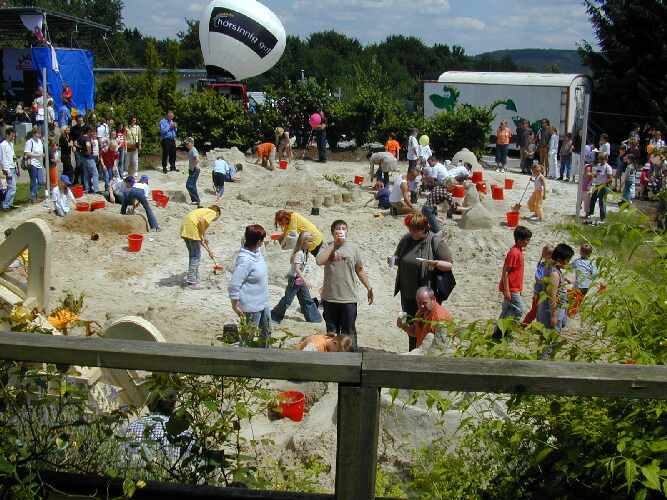 Der Sandburgenbau - Wettbewerb, das Sandlogo im Hintergrund