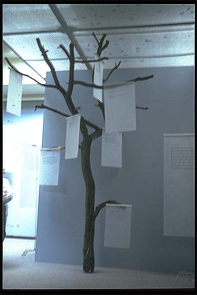 Der Baum wurde nach ein paar Tagen gefällt und weitesgehend zurechtgesägt. Der Transport mit dem Wagen quer durch Düsseldorf wird mir ewig in Erinnerung bleiben, da ich mit dem PKW hinterher gefahren bin und bei jeder Kurve bangte ob nicht doch ein Ast abbricht. Im Museum mußte der Baum leider noch weiter zurechtgestutzt werden, der er sonst nicht durchs Treppenhaus gepasst hätte. Erst nach der Befestigung wurde er mit literarischen Porträts von Heines "Lieblingsfeinden" bestückt, gleichsam Laub, des ansonsten kahlen Baumes.