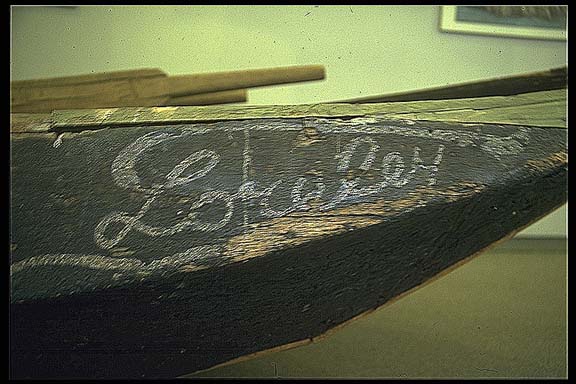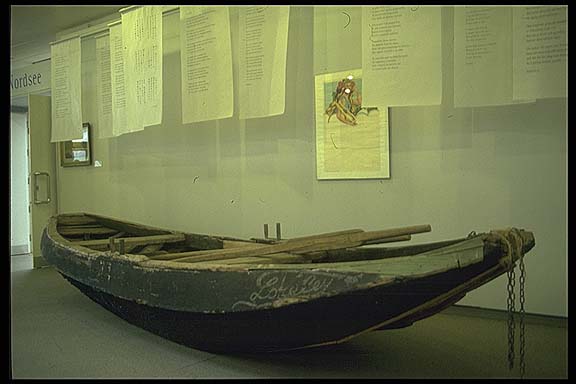 Natürlich darf in einer Ausstellung über Heine die Loreley nicht fehlen, und so wurden der Text der Loreleyliedes in über hundert Sprachen gedruckt und in der zweiten Etage Präsentiert. Ein weiteres Exponat welches über einigen Symbolcharakter verfügte, war ein Nachen aus den zwanziger Jahren der früher über den Rhein schipperte. Dieses Gefährt sollte nach dem Wunsch der Austellungsmacher den Namen Loreley bekommen und die Beschriftung sollte genauso alt aussehen wie das Boot. Der Leihgeber hatte eingewilligt, allerdings nur unter der Bedingung, daß der Schriftzug nach Beendigung der Ausstellung wieder entfernt werden konnte. Ich entwarf verschiedene Schriftmuster die in dieser Zeit üblich waren. Die Position des Schriftzuges wurde mit wasserlöslicher Grundierung versehen und die Pigmente wurden mit dieser Grundierung gebunden, d.h. der Schriftzug war einfach abwaschbar. Somit war dem Wunsch des Ausstellungsmachers und des Leihgebers genüge getan.
