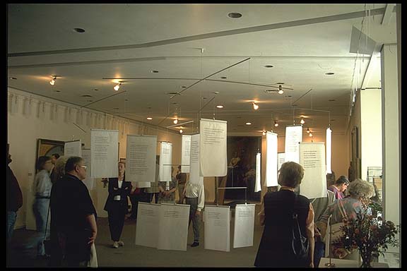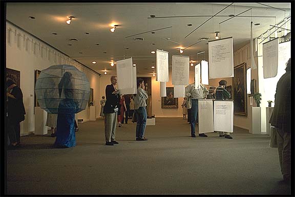 Foto Textmobile Das Textmobile sollte ursprünglich 16 m Durchmesser haben, aber der Raum ließ nur 8 m zu. Es sollte leicht und luftig wirken, wie alles im "Frauenraum". Ich entwarf verschiedene Varianten ein Freund - Manfred Etzweiler - empfahl mir V2A Rohre und wir feilschten um den Durchmesser, denn je unsichtbarer desto besser. Er führte die Umrechnung von Modell zu Realität aus und brachte die entsprechenden Bohrungen an - und dann der große Moment - schwebt es oder schwebt es nicht... Foto Textmobile