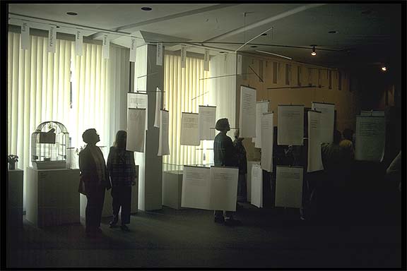 Es hat geschwebt, ganz ausgewogen, leicht und luftig um die Besucher herum. Sie haben es offensichtlich gerne angenommen, denn immer wenn ich den Raum betrat, sah ich Lesende und Staunende... Foto Textmobile, links Heine-Texte rezitierende Dame