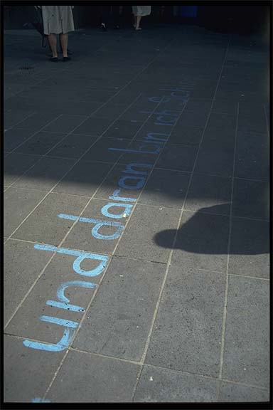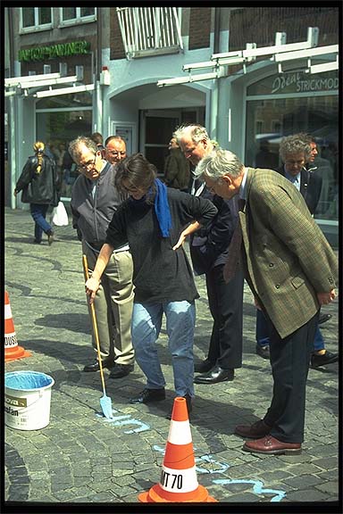Der Weg führte über Gehwegplatten, Waschbetonplatten und Pflastersteine. Da wo Heines Geburtshaus einst gestanden hatte lautete der Text "und hier bin ich geboren", was den Leiter des Heine Institutes in besonderes Entzücken versetzte. Drei Tage dauerte die ganze Aktion, mein Lebenspartner Hagen Schulz-Hanke begleitete mich und dokumentierte die Aktion, trug Farbeimer und las mir den Text vor und hielt allzu anstrengende Passanten von mir fern . Als wir am dritten Abend am Grabbeplatz ankamen und die Treppen zur Kunsthalle raufschrieben waren wir beide müde und erschöpft, aber glücklich.
